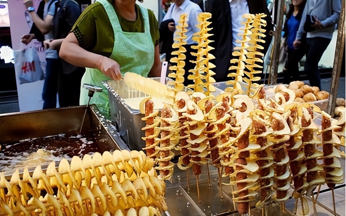 这是一道很受韩国年轻人欢迎的凉菜。说起泡菜之国的特色菜肴,就一定要提到龙卷风马铃薯,也就是韩国人所说的Hweori Gamja。土豆龙卷风不仅席卷了韩国,还席卷了从亚洲到欧洲的许多其他国家,其中越南就是一个典型。龙卷风马铃薯是一道典型的韩国街头美食,它只是将土豆串在竹签上,然后用一些典型的食材腌制,然后油炸而成。咬上一口脆香、腻的士豆,你会感到无比的幸福,这是任何一道用土豆做的菜都无法带来的特殊风味。虽然在越南的路边小吃摊上很容易找到龙卷风薯片,但在韩国,这道菜还是有自己的味道,一定要亲自尝尝,才能体会到其中的不同。