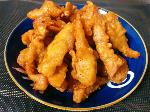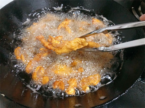 (4)锅中倒入花生油,烧至8成热,放进腌制好的肉条,开小火炸至微黄捞出