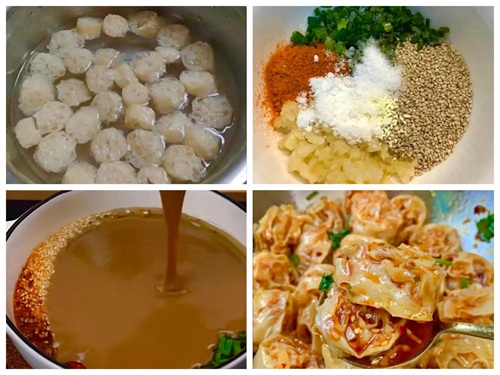 (3)料汁:碗中加2勺葱花、2勺熟芝麻、2勺蒜末、2勺辣椒面、1勺盐、1勺糖、1勺鸡精,淋入热油,搅拌均匀,最后倒入稀释好的芝麻酱