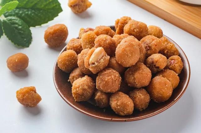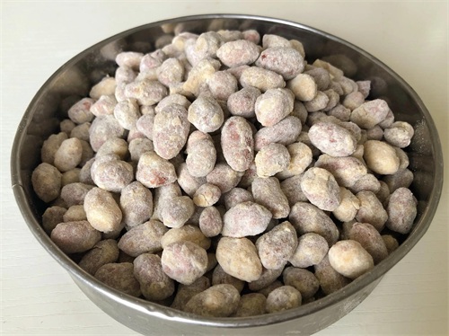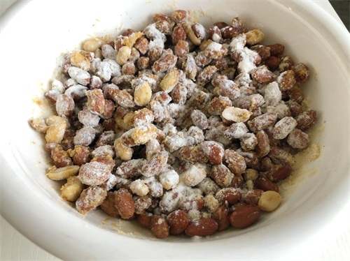 4、最后是这种互不粘连的状态,颗颗分明,然后过滤一遍,把花生多余的干粉筛干净