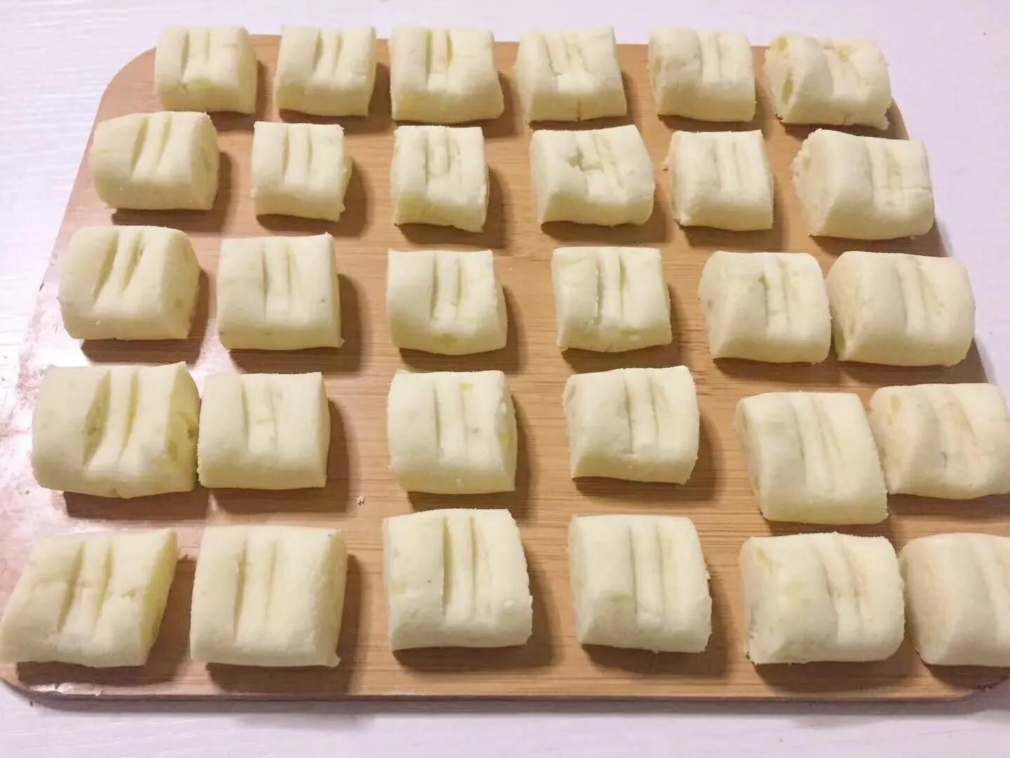 5、然后切成3厘米左右的小段,用叉子在每个小饼上压一下,不要太用力,压出清晰的纹路就好