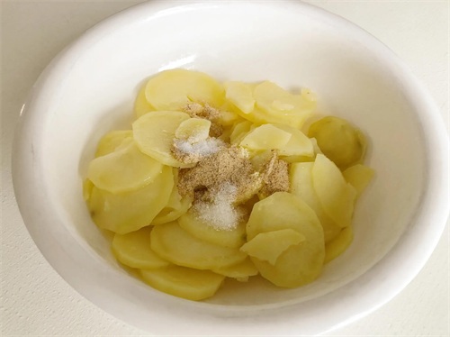 2、用筷子试一下能轻松穿透就可以了,蒸好的重量刚好是500克,趁热倒进盆中,加适量盐,1勺五香粉,1勺鸡精,1勺胡椒粉,压成细腻的土豆泥