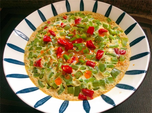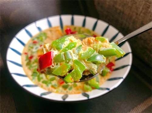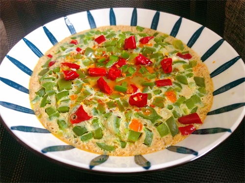 (3)紧接着再磕入5个鸡蛋,搅散,把刚才切好的青椒,辣椒均匀地撒在上面