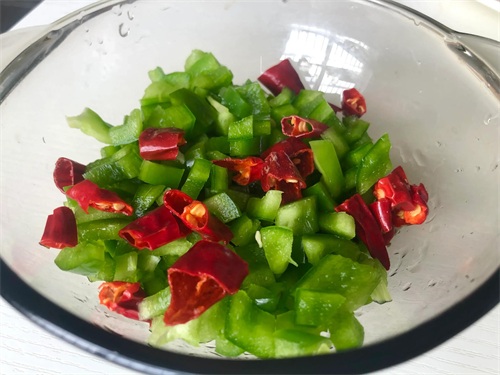 (1)先把青椒清洗干净,去籽切成小丁,辣椒切成小圈