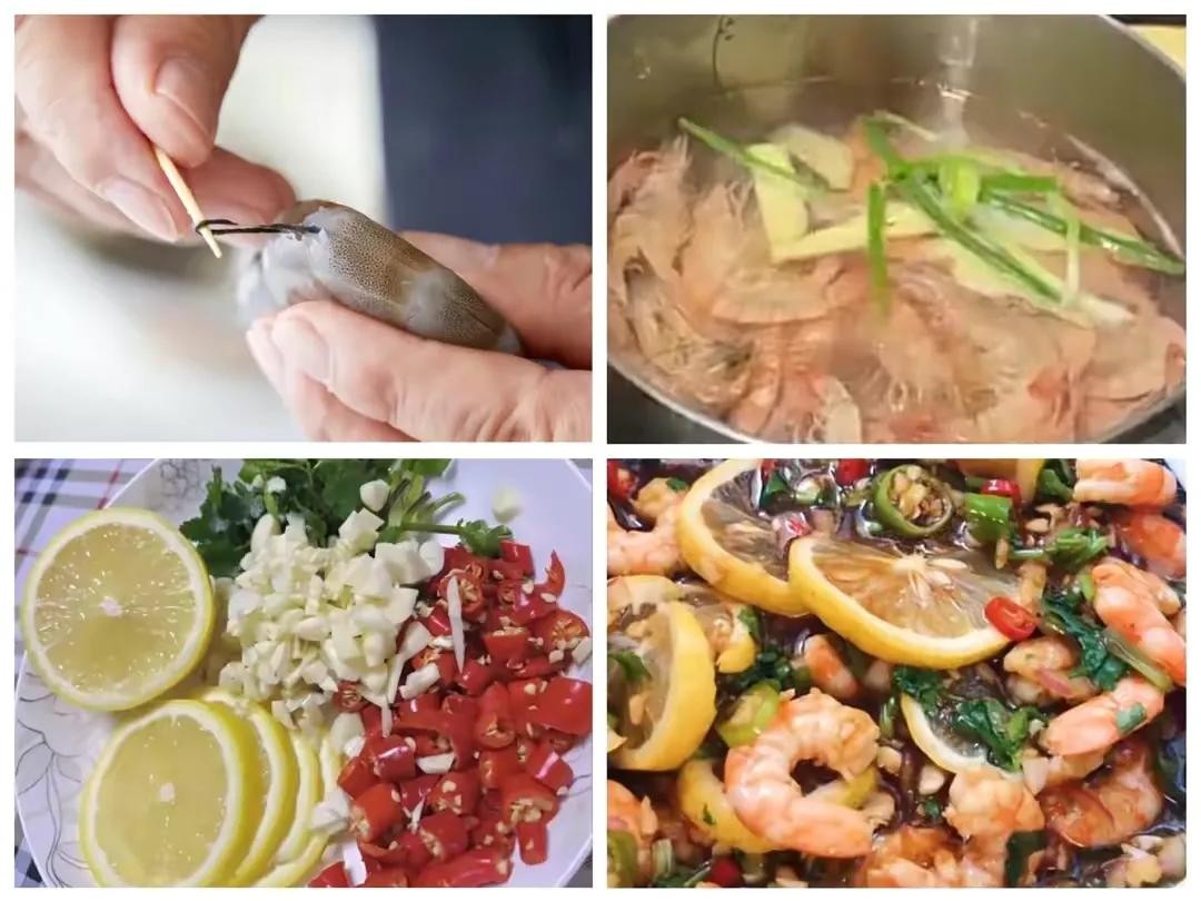 1、食材明细:虾、柠檬、洋葱、蒜、香菜、线椒、小米椒、白醋