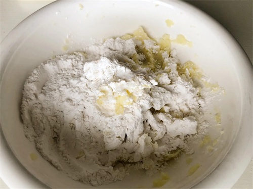 3、接着准备150克玉米淀粉倒进去,先用筷子搅拌成土豆疙瘩,然后再下手揉成面团