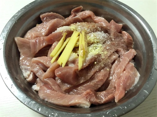 (1)先把里脊肉清洗干净切成条状,放进碗中加上盐,豆油,料酒,生抽,腌制10分钟
