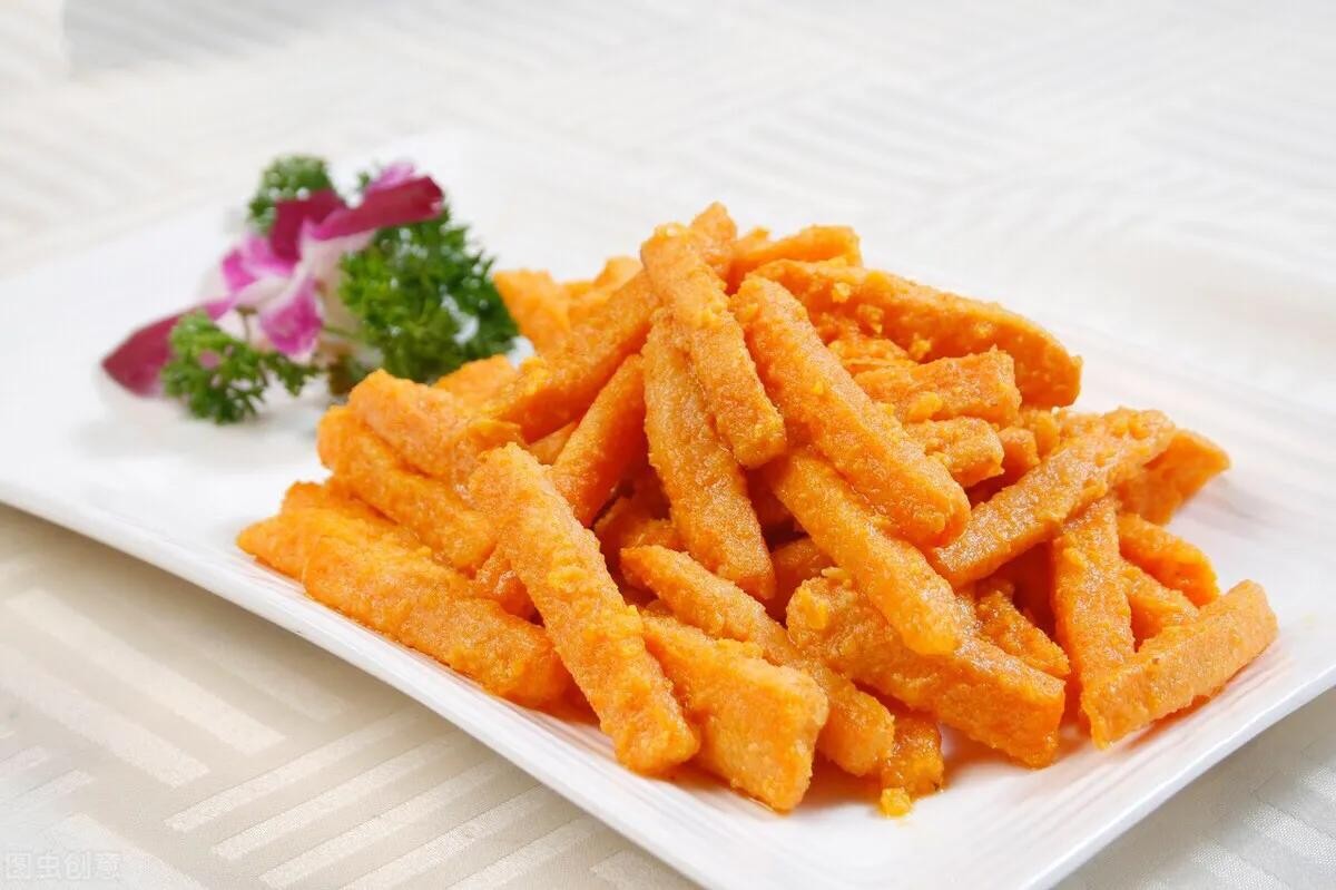 (4)待油烧至7成热,逐个下入南瓜条,先不要搅动,等炸至定型后再翻动,让它均匀得受热,炸好后捞出来,控油