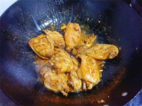 3、油烧热后,先倒入鸡翅煎一下,勤翻面,煎至鸡皮呈现金黄色,就可以倒入可乐了,没过鸡翅的位置