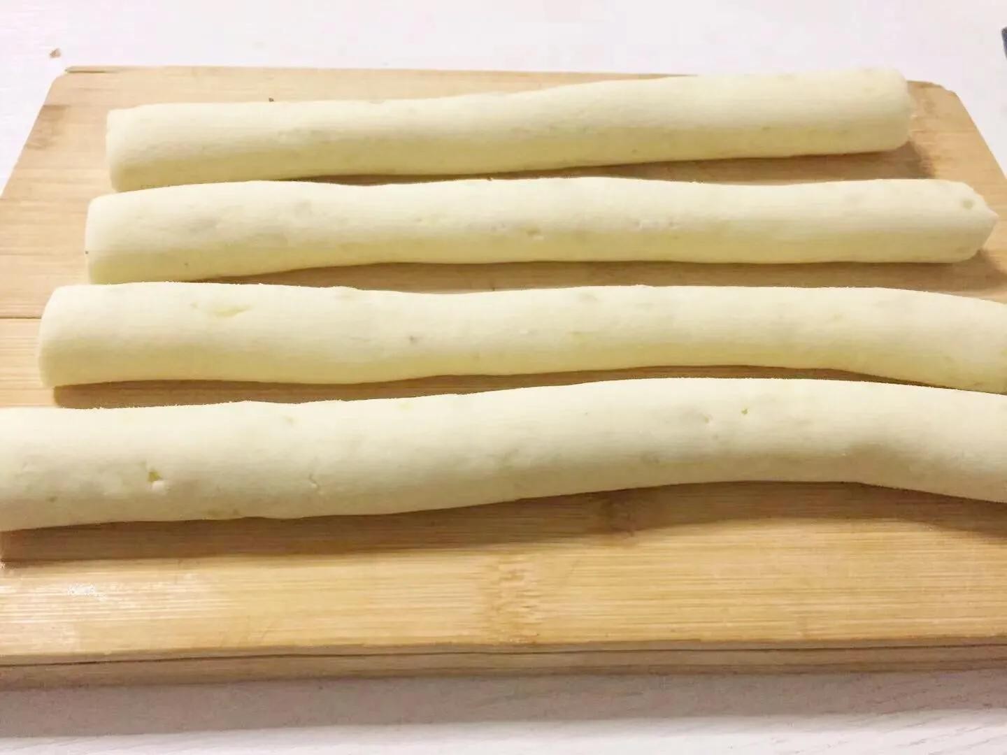4、不用醒面直接放到面板上,揉光揉透,分成4份,每一份都搓成细长条