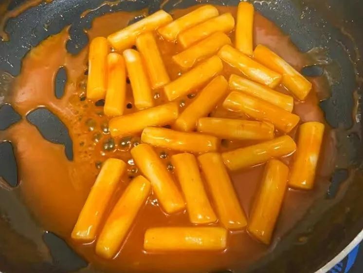 4、接着下入年糕条,开小火炒至裹满酱汁即可出锅,最后撒上芝麻和葱花点缀一下