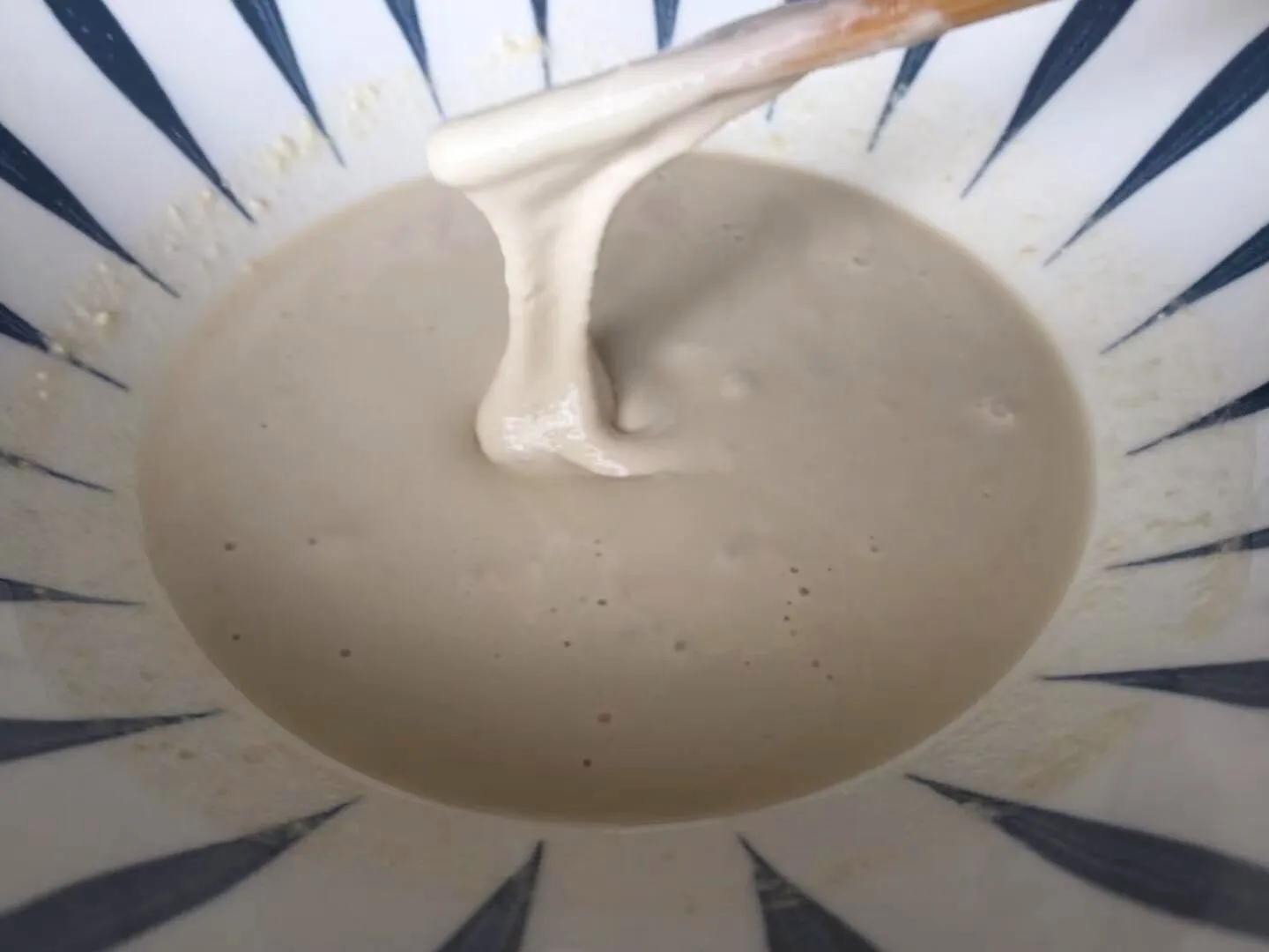 (2)然后准备1个大碗,打入一个鸡蛋搅散,再加少许水,分多次加入土豆淀粉,最后是这样缓慢流动的稠糊状