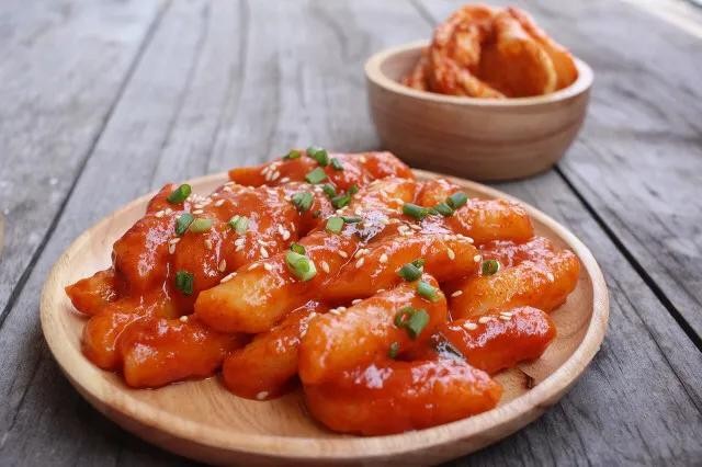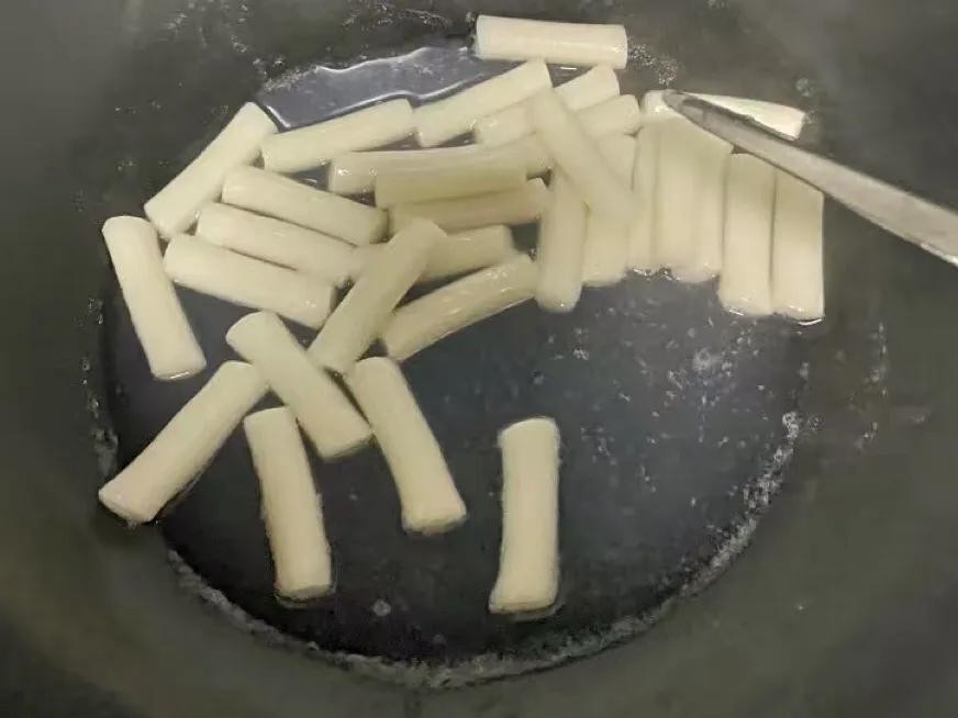 《食材》年糕条1包、辣白菜100克、糖2勺、盐、味精、湿淀粉、辣椒酱2勺、香油1勺、少许胡椒粉、大蒜