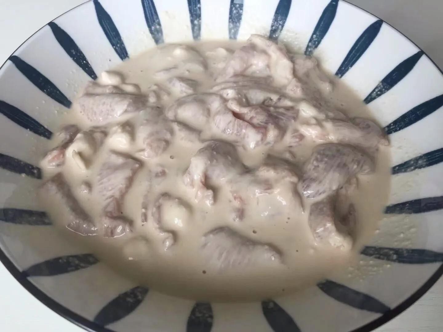 (3)接着把腌制好的肉条放进来,搅拌一下均匀地裹上面糊即可