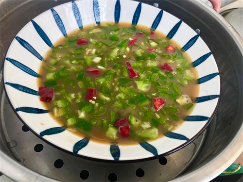 (4)水开后放进蒸笼,中火蒸15分钟,可以用筷子戳进去试一下,如果都凝固后就可以出锅了,淋上香油增加香味