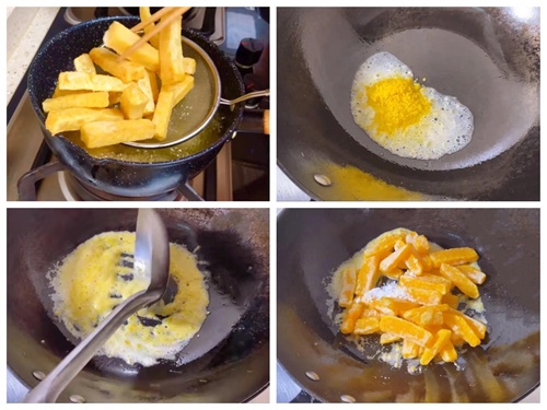 (5)炒锅倒油,把刚才捣碎的咸蛋黄放进来翻炒,用勺子不停地搅拌,看起来出现很多气泡时,倒入南瓜条