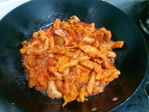 (5)另起锅,加一勺番茄酱,一勺水,一勺醋,一勺糖,把糖熬至融化,放进炸好的肉条翻炒,均匀地裹上酱汁就好了