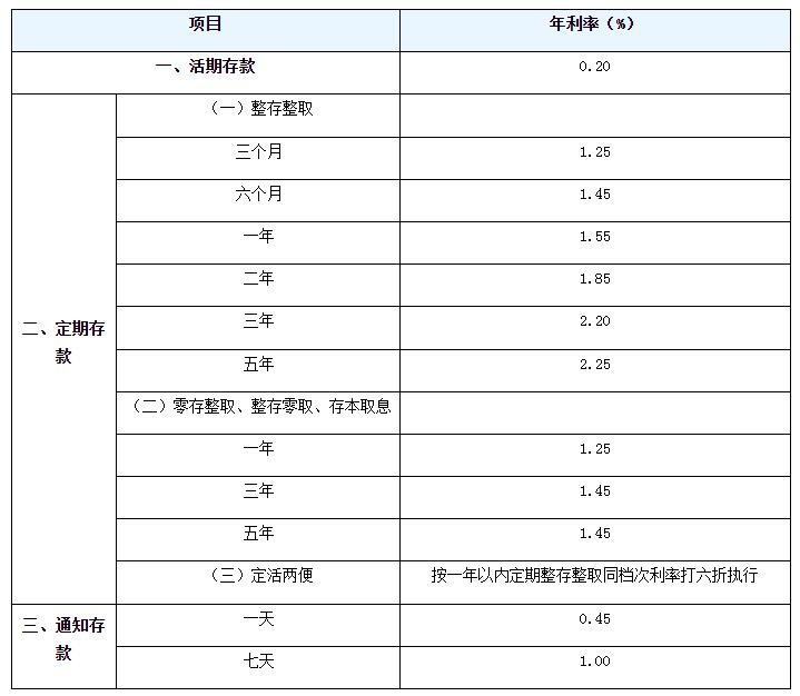 农业银行定期存款利率表