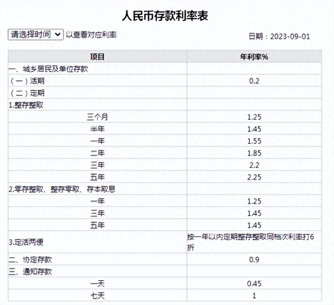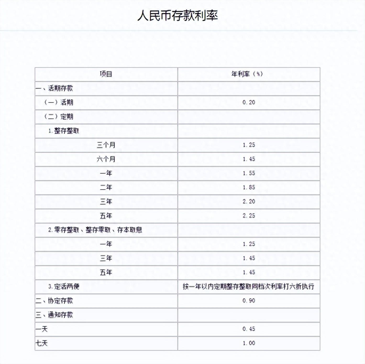 中国银行定期存款利率表