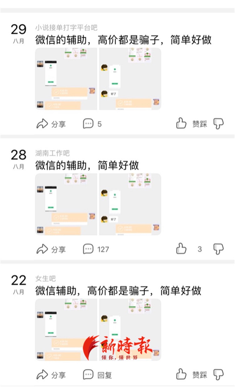 记者在百度贴吧搜索微信辅助解封,发现有不少人在兼职贴吧、游戏贴吧发布相关信息,并配文“简单好做”。一番筛选后,记者添加了一名“放单人”的微信。