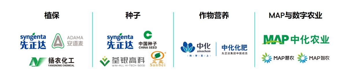 先正达集团旗下四大业务单元分别是先正达植保、先正达种业、安道麦、先正达集团中国。前三个单元在全球开展业务,先正达集团中国,则聚焦中国,统筹管理国内各农化业务及企业,包括作物保护相关的安道麦中国、先正达植保中国、扬农化工,种业相关的中国种子集团、三北种业、先正达种业中国、荃银高科,化肥相关的中化化肥,农业服务相关的MAP与数字农业。业务涵盖农业生产相关种子、肥料、农药自研发、生产、销售,并具备农业现代化服务为一体的农化企业。