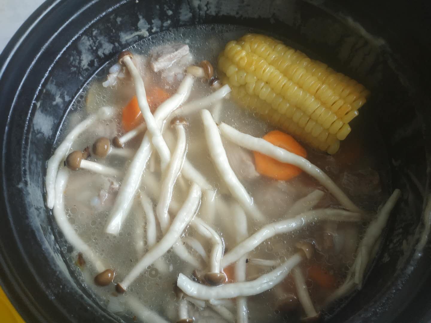 3,倒入温水,水量没过排骨,倒入一勺料酒,小火慢炖30到40分钟后,放入清洗好的玉米,海鲜菇,胡萝卜,继续炖50分钟。