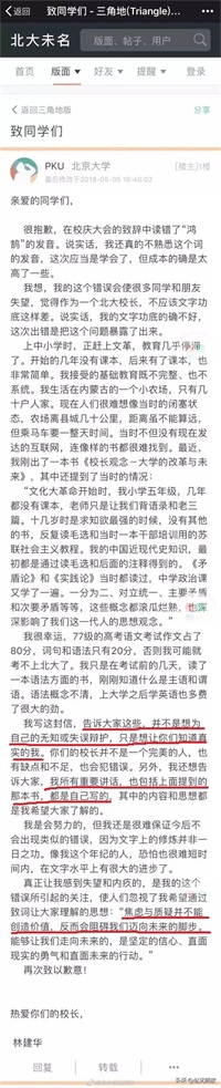 林建华校长在北大未名BBS上的致歉信。网络截图。