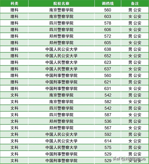 而男生分数最低的院校是南京警察学院、中国刑事警察学院,最低分为560分,女生分数最低的院校是南京警察学院,最低分为603分。
