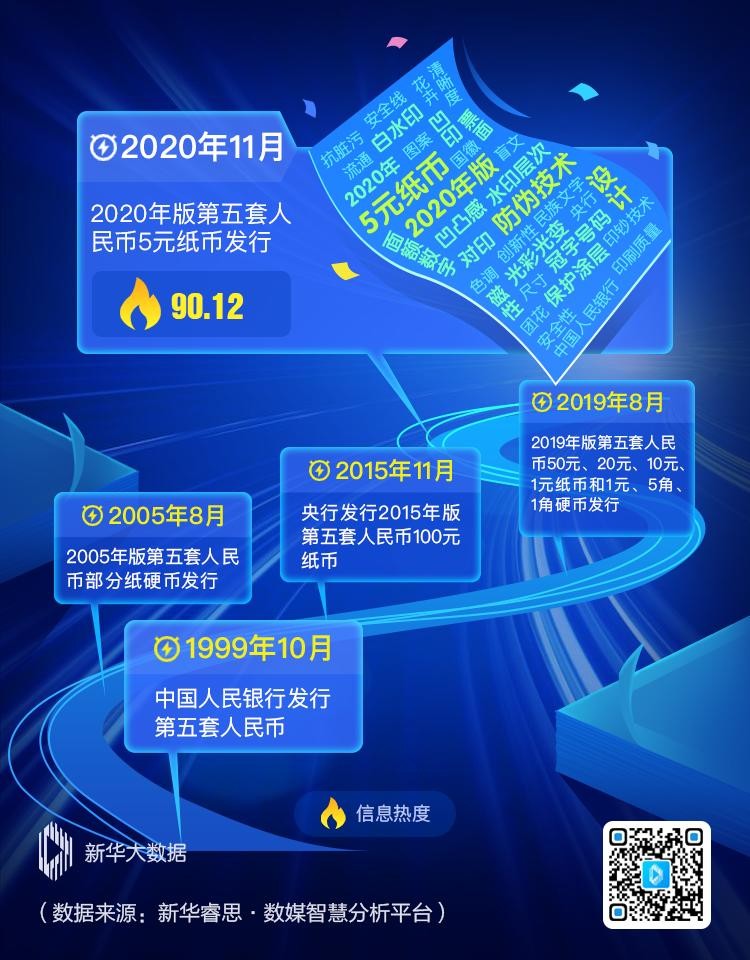 第五套人民币100元、50元、20元、10元和1元纸币最近几年都已陆续发行新版,一直没变的5元纸币终于也旧貌换新颜啦!新华睿思数据显示,该消息的网络热度高达90.12。其中,网民对2020年版5元纸币的最新“设计”和“防伪技术”最为关注。