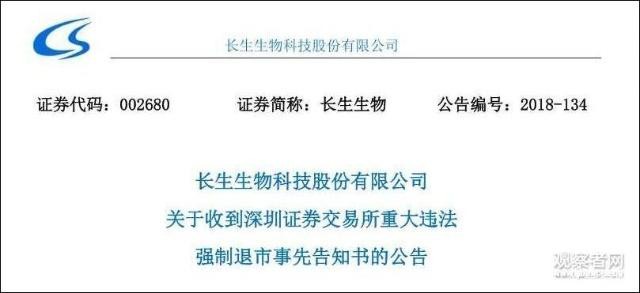 公告指出,根据《深圳证券交易所重大违法强制退市事先告知书》,深交所可能对长生生物股票(*ST长生)实施重大违法强制退市。后续,深交所将根据相关规则作出是否对*ST长生实施重大违法强制退市的决定。