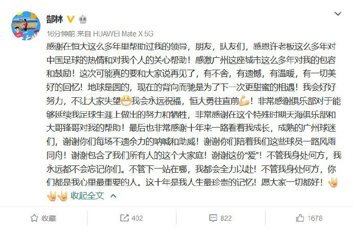 “这次可能真的要和大家说再见了,有不舍,有遗憾,有温暖,有一切美好的回忆!非常感谢俱乐部对于能够延续我足球生涯上做出的努力和牺牲,你们都是我心里最重要的人。这十年是我人生最珍贵的记忆!愿大家一切都好!”