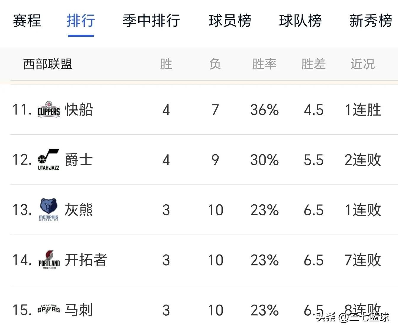 爵士3胜9负暂居西部第十二,灰熊,开拓者,马刺战绩相同,均是3胜10负,其中开拓者7连败,拥有文班亚马的马刺队8连败西部倒数第一。