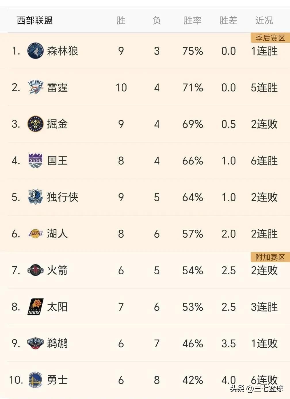且看西部各队排名情况: