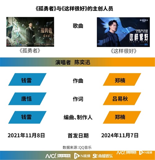 南都记者也对比了两首作品的主创人员。《孤勇者》由钱雷作曲、编曲、制作,作词人唐恬作词。歌词中充满了对英雄主义的赞美,旋律激昂、振奋人心,再配以陈奕迅独特的嗓音,也令歌曲迅速走红。