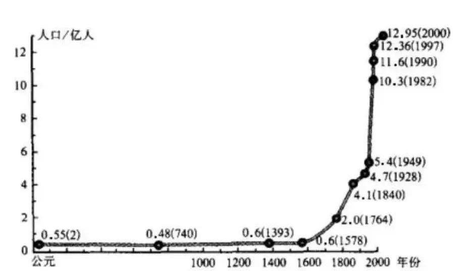 但是,如果我们看一下下面这张图,我们就能发现,这个问题似乎解决了。从17世纪开始,中国的人口开始了指数级别的增长,远远超过了历史上的其他时期。清朝初期才1亿人,而清朝末期,却达到了4亿。