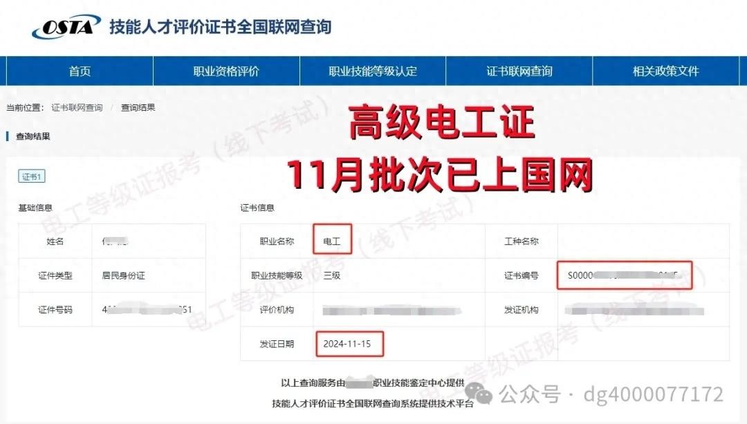 高级电工证书查询入口官网。11月批次高级电工证已上国网
