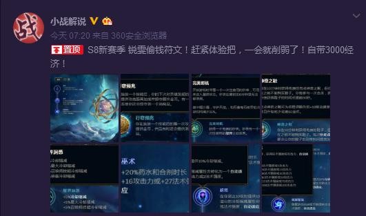 英雄联盟s8赛季来临,本赛季给玩家们最大的惊喜莫过于符文系统的改变。新符文系统让人摸不到头脑,甚至有些玩家表示,怕是要重新玩一次这个游戏了。大神主播们都在直播间和玩家一起讨论,而国服第一锐雯主播小战更是一夜未眠,研制出一套最强锐雯符文,自带三千经济。