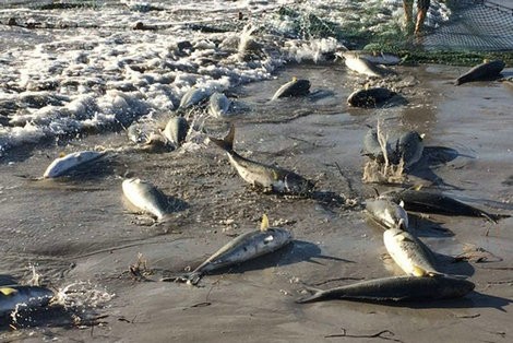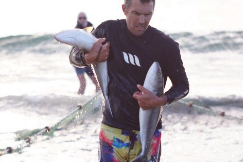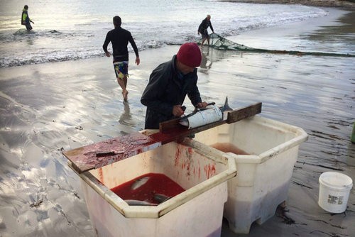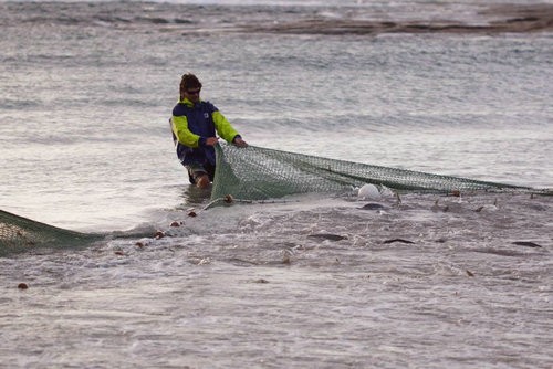 图为Parry海滩上,渔民在捕捞三文鱼。