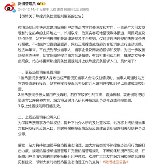 3月12日,微博管理员发布《微博关于热搜词条处置规则更新的公告》: