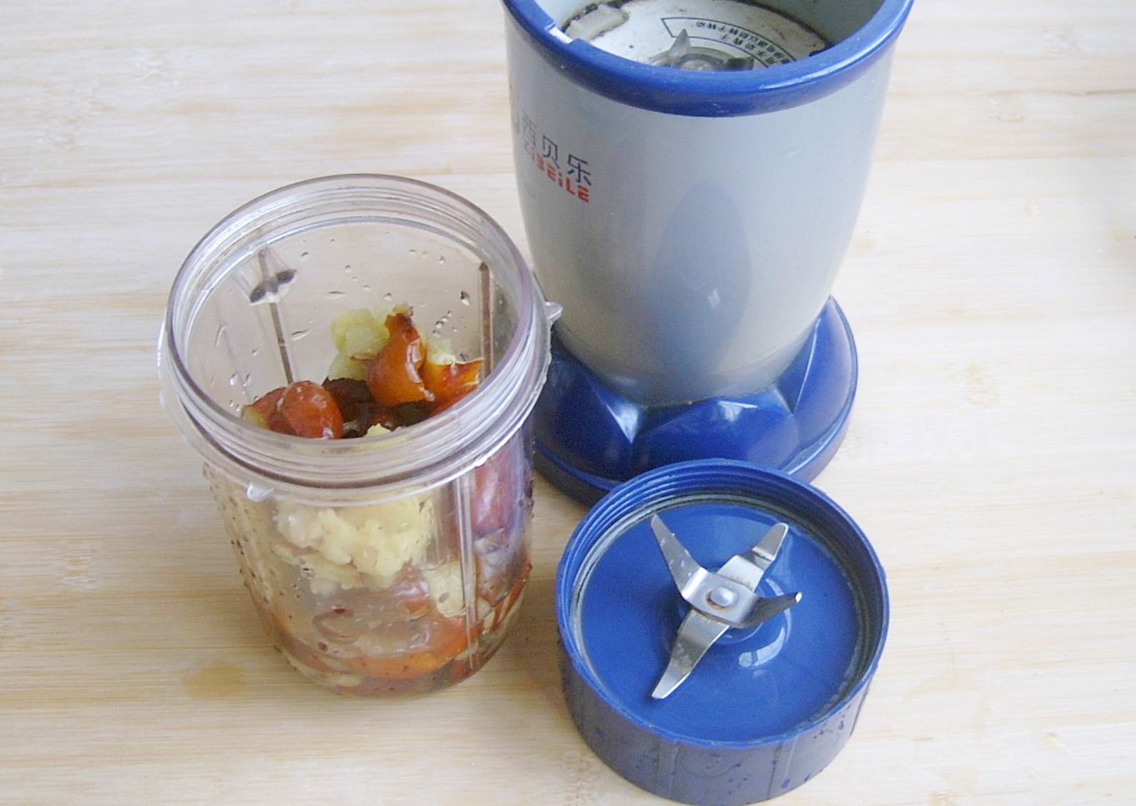 5、放入料理机中,加少许水打成粘稠的枣泥
