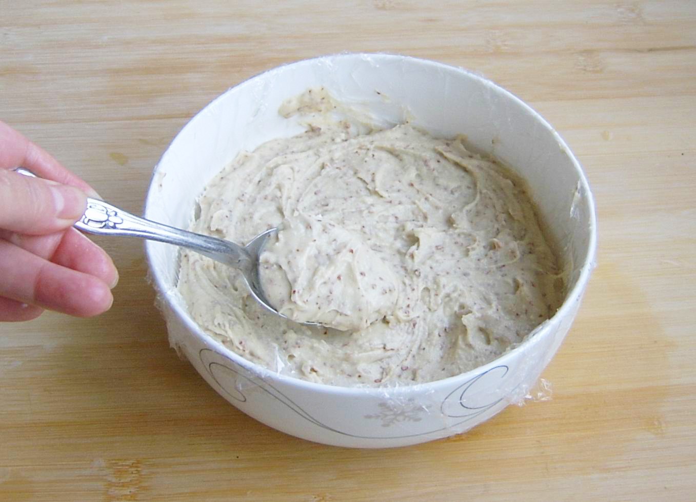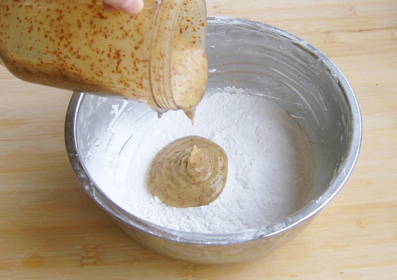 6、将另一半的糯米粉、大米粉按照2:1的比例混合,加枣泥搅拌成糊