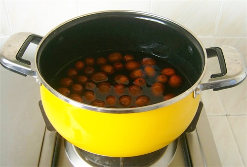 3、大枣加水放入锅中,煮半小时,煮至红枣变软取出