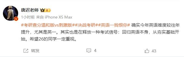考研英语讲师唐迟老师发文谈2025考研英语难度。他表示:“确实今年英语难度较往年提升,尤其是英一。其实也是在释放一种考试信号:回归英语本身,从夯实基础开始。希望26的同学一定重视。”