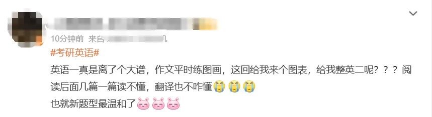 考生们纷纷在社交平台上分享自己的考试体验。许多考生表示英语一的难度较大,尤其是作文部分出现了图表题,令不少考生感到困扰。
