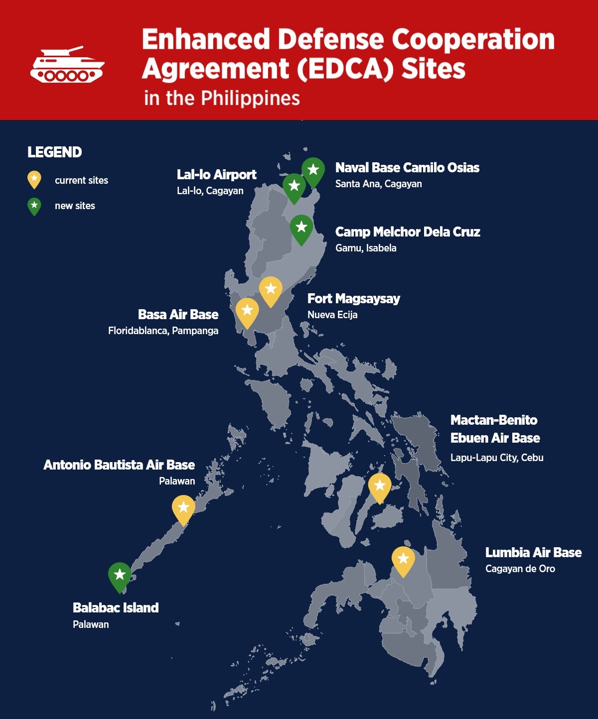 根据2023年的美菲加强防务合作协议,菲方向美新开放4处驻军设施(,总数达到9处,其中吕宋岛上即有5处。