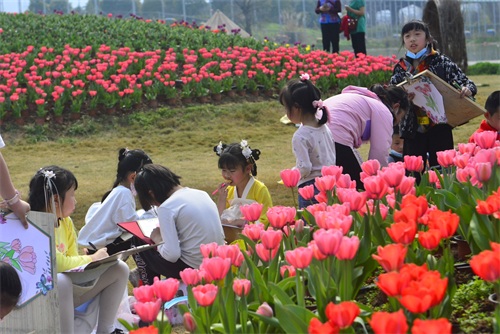 走进蔚然花海,只见几十万株红、蓝、紫、黄等郁金香和盧美人开得娇艳,花丛中、草坪上……几十种花卉精美搭配,让过往的游客纷纷举起手机和相机,定格成优美的花海景色。除了大片的郁金香和盧美人外,百日草也在园区随处可见,橘色、粉色、大红等各种颜色交相辉映,像在一片片绿毯上打翻了调色板,明亮艳丽。而红色的松果菊,则如一颗颗欢呼跳跃的小松果,将地面铺成了一片红色的海洋,煞是好看。