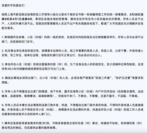 据"上海奉贤"消息,所有人员不得擅自走出家门到楼道、地下车库、露天区域等小区(村组)内户外空间活动(包括散步遛弯、运动健身、逗遛宠物、集聚攀谈、吸烟晾晒等),邻里间不串门、不聚会、不聚餐,见面不握手、不逗留、不寒喧。