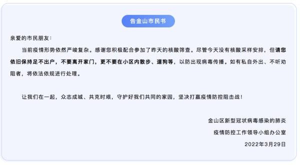 据"金山发布"消息,尽管今天没有核酸采样安排,但请您依旧保持足不出户,不要离开家门,更不要在小区内散步、遛狗等,以防出现病毒传播。