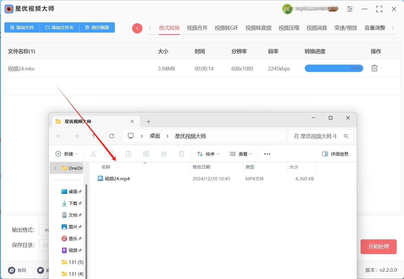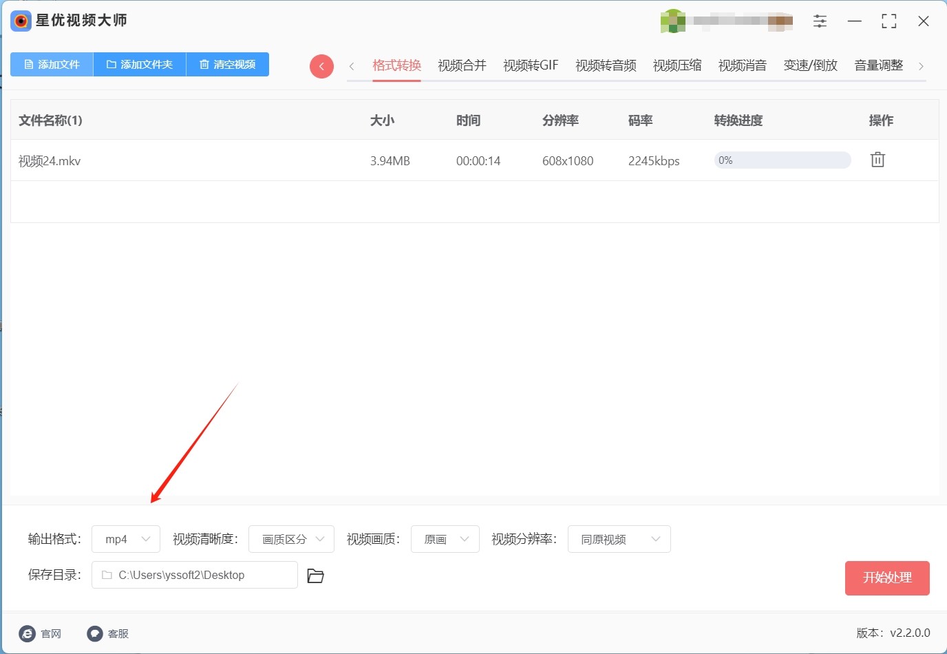 步骤4:完成所有设置后,您只需点击软件界面右下角的【开始处理】按钮,“星优视频大师”便会立即开始执行MKV到MP4的转换任务。