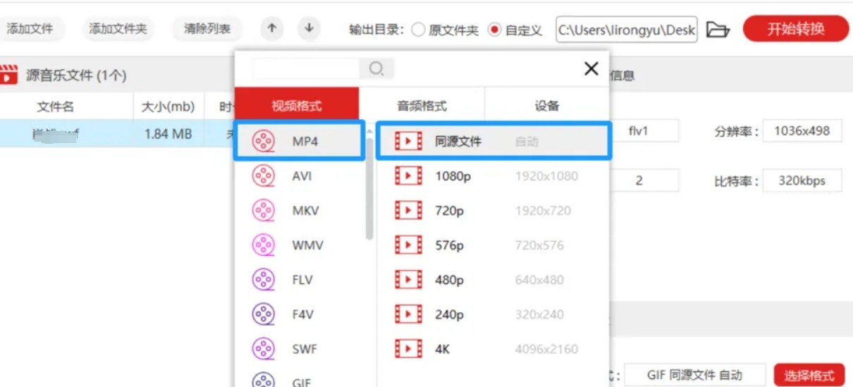 选择输出格式:在界面的下方,找到 “输出格式” 的选择框。点击下拉菜单,选择 “MP4” 格式。